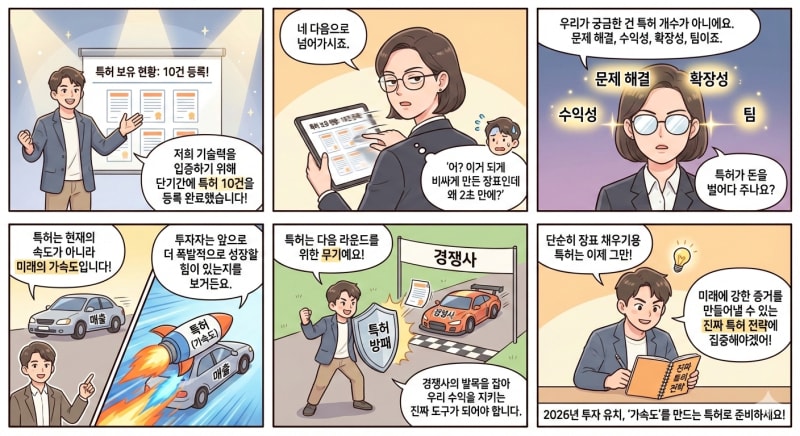 특허 관련 장표를 넣는 것 자체가 필수는 아닙니다. 다만 특허 전략이 ‘경쟁사의 출시 지연’이나 ‘회피 설계로 인한 비용 상승’처럼 다음 라운드에서 매출·수익성 개선 혹은 경쟁사 약화로 이어질 수 있는 구조라면, 특허는 ‘장표 채우기용’이 아니라 ‘성장 전략의 일부’로 기능할 수 있습니다. 그때는 넣어야 하는 이유가 명확해집니다.