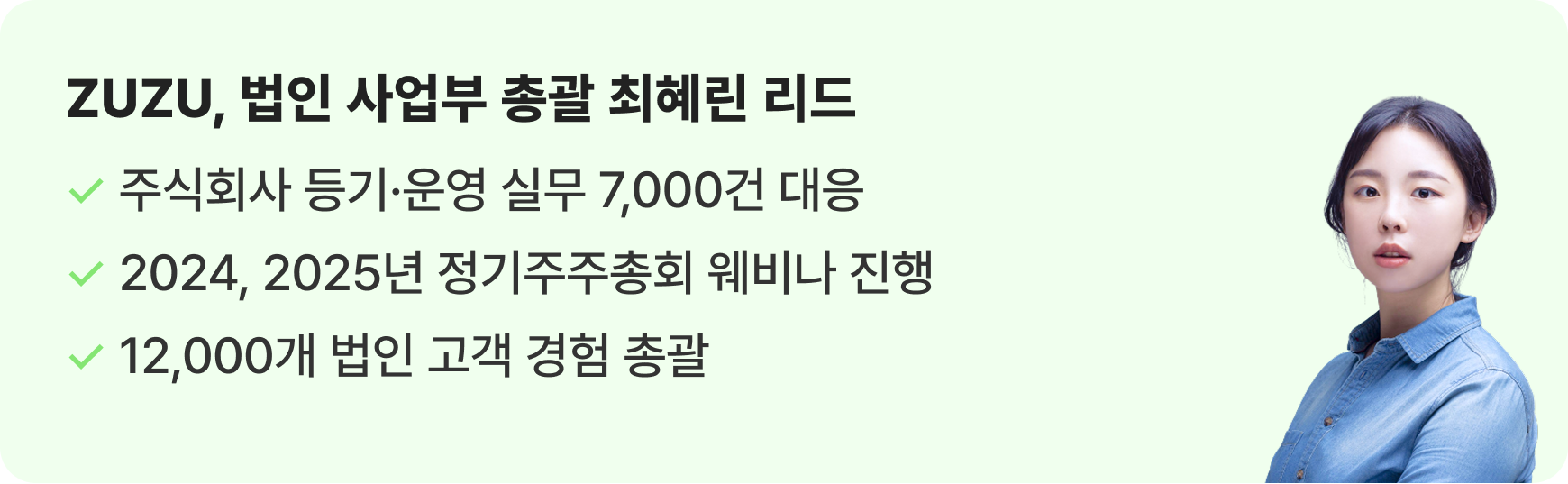 정기주주총회는 법에서 정한 의무로 여겨질 수 있지만, 지난 한 해를 정리하고 올해의 방향을 공유하는 중요한 자리이기도 합니다. ZUZU는 수많은 고객사의 주주총회·이사회를 지원하며, 실무에서 필요한 경험과 인사이트를 쌓아왔습니다. 이번 웨비나에서는 정기주주총의 핵심 개념부터 실무에 바로 쓰는 팁까지 한 번에 알려드립니다. 법무법인 민후 변호사와 함께하는 실시간 Q&A로 우리 회사 상황에 맞는 해답도 확인해 보세요.